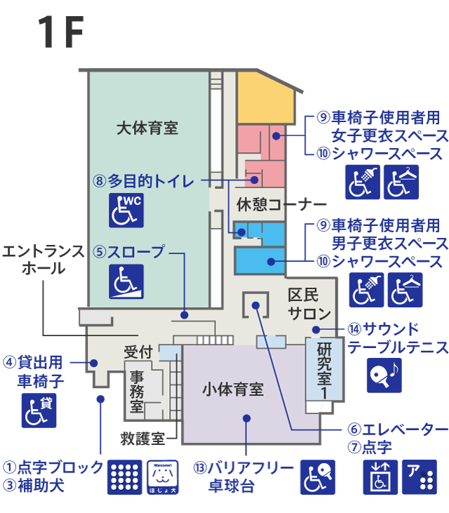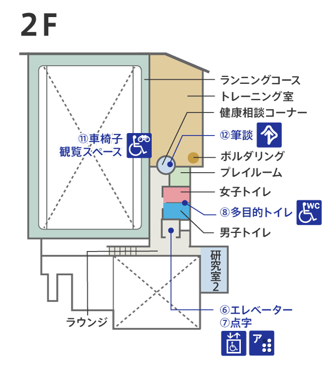 1階と2階に多目的トイレがあります。1階の男女のトイレは、それぞれオストメイト用の設備を備えています。